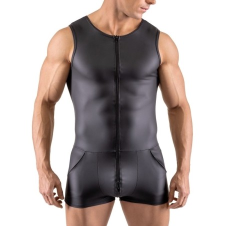 Combinaison avec zip avant et arrière pour les fesses.Tissu imitation de l'aspect cuir mat. Composition : 90% Polyester, 10% Élasthanne. Revêtement Polyuréthane.