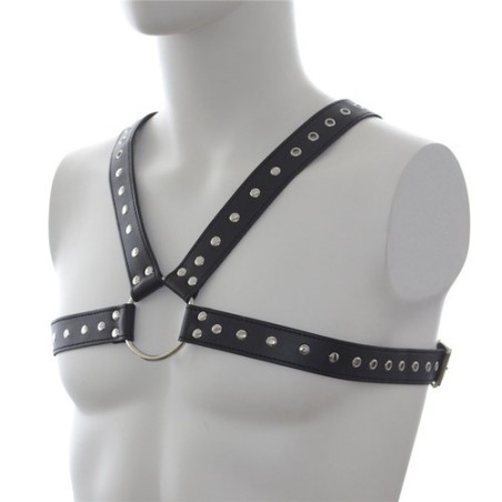 Harnais SM en Faux cuir et rivets métalliques.Les boucles et attaches sont aussi métalliques pour un contraste parfait. Ce harnais pour homme vous assure un look de dominant face à votre partenaire.Il a une forme en croix sur le devant avec les lanières du bas mises de façon droite sur les pectoraux