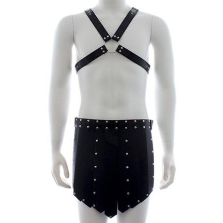 Ce kit est composé d'un harnais avec une forme de croix sur le torse et à l'arrière. Il est assorti d'un kilt avec bandes souples de 40cm de longueur. Tour de taille de 88 à 110cm.   Fabriqué en simili (polyuréthane)