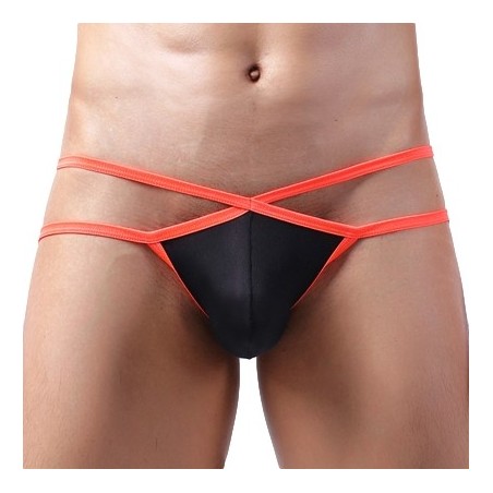 Jockstrap noir avec des ficelles orange et croisées.Pour un style sexy. Le tissu est fin. Composition : 88% Polyester, 12% Élasthanne