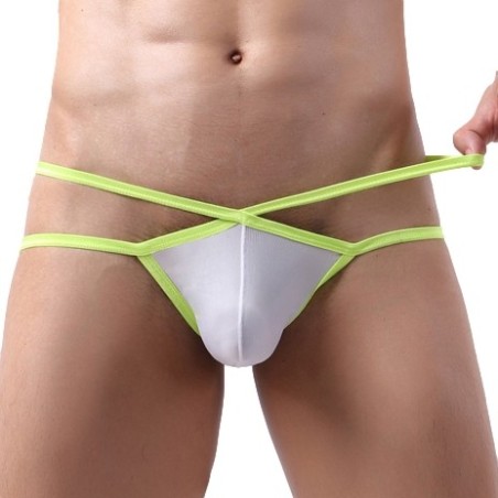 Jockstrap blanc avec un tissu fin et transparent.Ficelles fines jaune fluo en contraste. Composition : 88% Polyester, 12% Élasthanne
