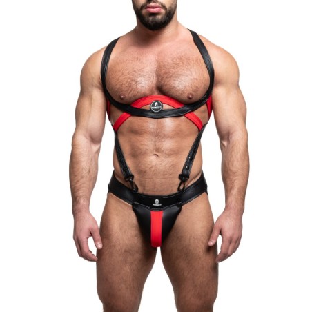 Ensemble de 2 pièces avec un harnais et un jockstrap.Harnais avec une forme originale et des mousquetons qui se fixent sur le jock.Partie avant amovible. En néoprène. Composition : 80% Polyamide, 20% Élasthanne