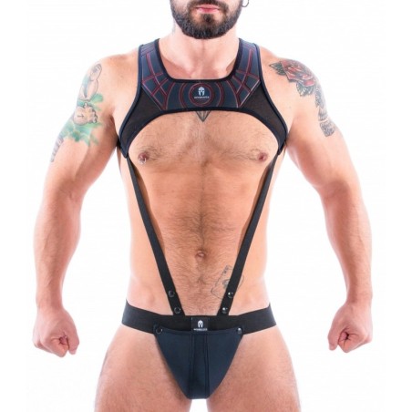Cet ensemble est composé d'un jockstrap et d'un harnais en néoprène.Avec un anneau en métal de 60 mm.La partie avant du jock est amovible. Composition : 78% Polyamide, 22% Élasthanne. Patch 100% latex