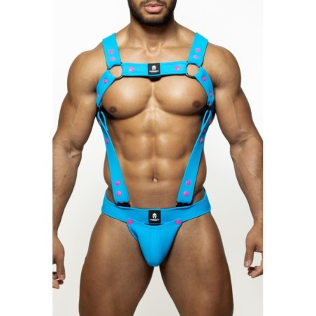 Ensemble bleu et rose avec un harnais et un jockstrap.Sangles ajustables en néoprène.Avec un anneau en métal de 60 mm pour placer sur le sexe (amovible).Composition : 80% Polyamide, 20% Élasthanne