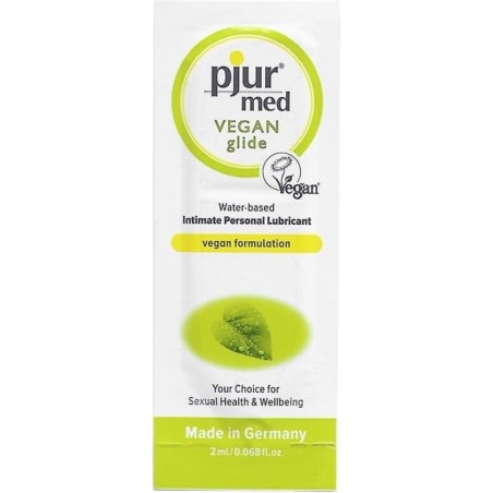 Voici une dosette de 2ml du lubrifiant Vegan de la marque Pjur. Il a une formule à base d'eau et avec de composants d'origine naturelle et non animale.La texture est fluide et non collante. Sans glycérine, sans parabène. Il est compatible avec les préservatifs